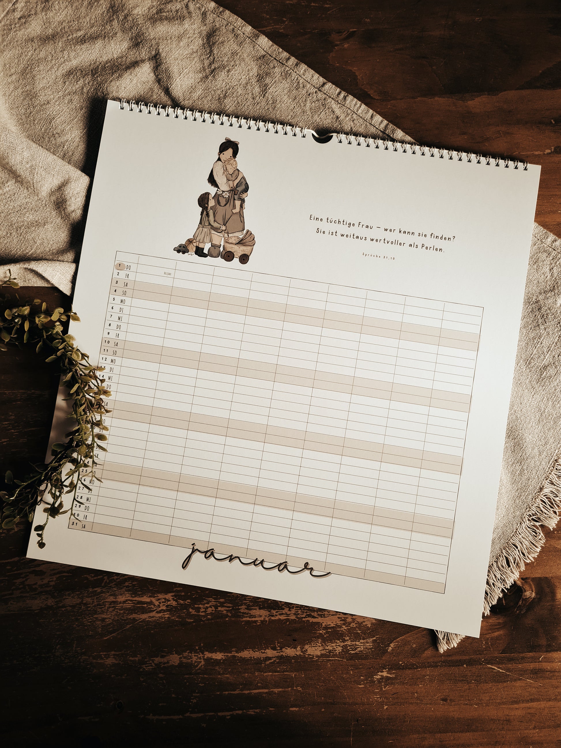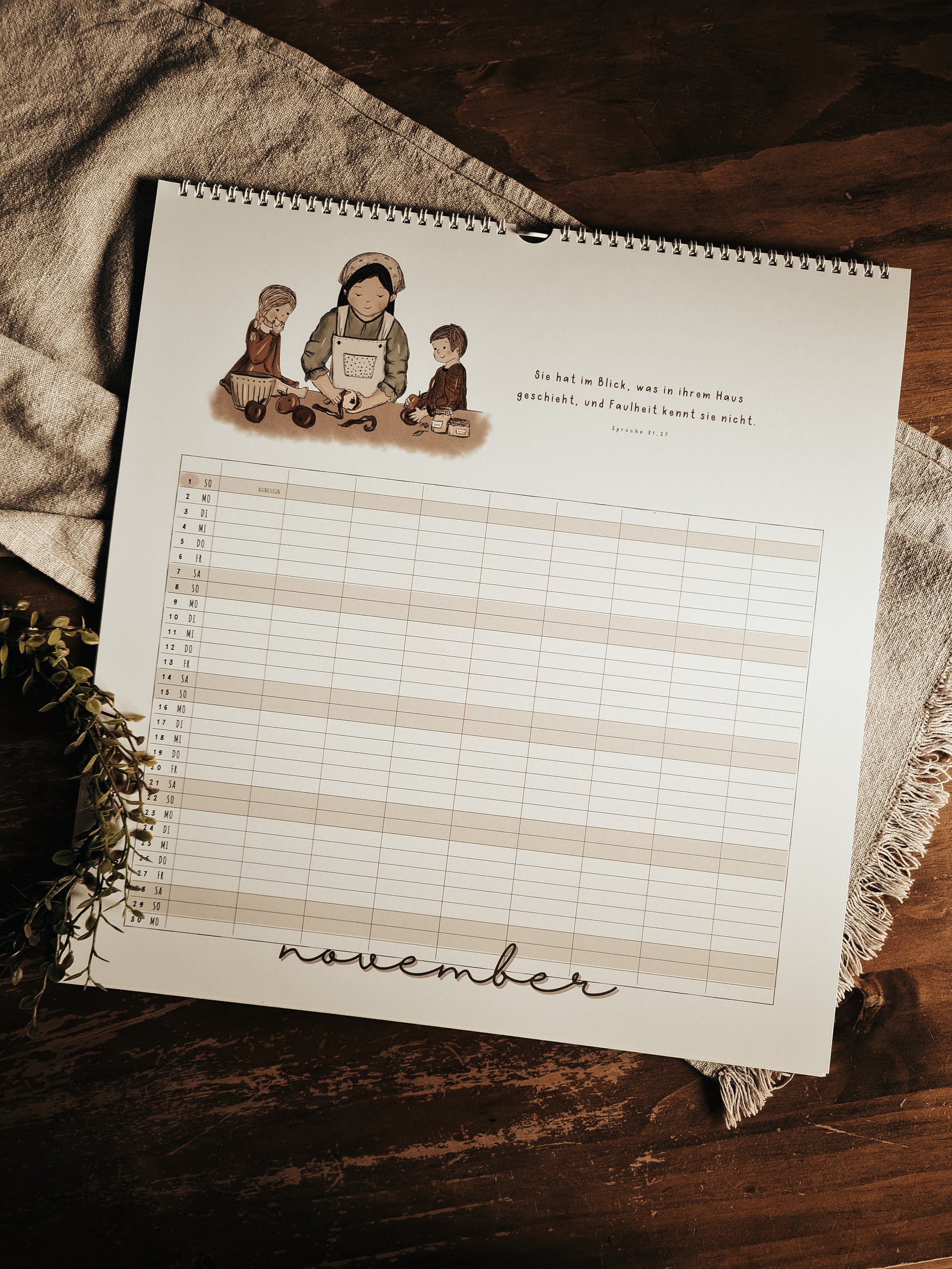 Liebevoll gestalteter Planer für besonders große Familien! Mit neun Spalten findet hier wirklich alles einen Platz. Jeden Monat erwartet dich ein idyllisches Alltagsmotiv und ein alltagsnaher Bibelvers aus Sprüche 31.