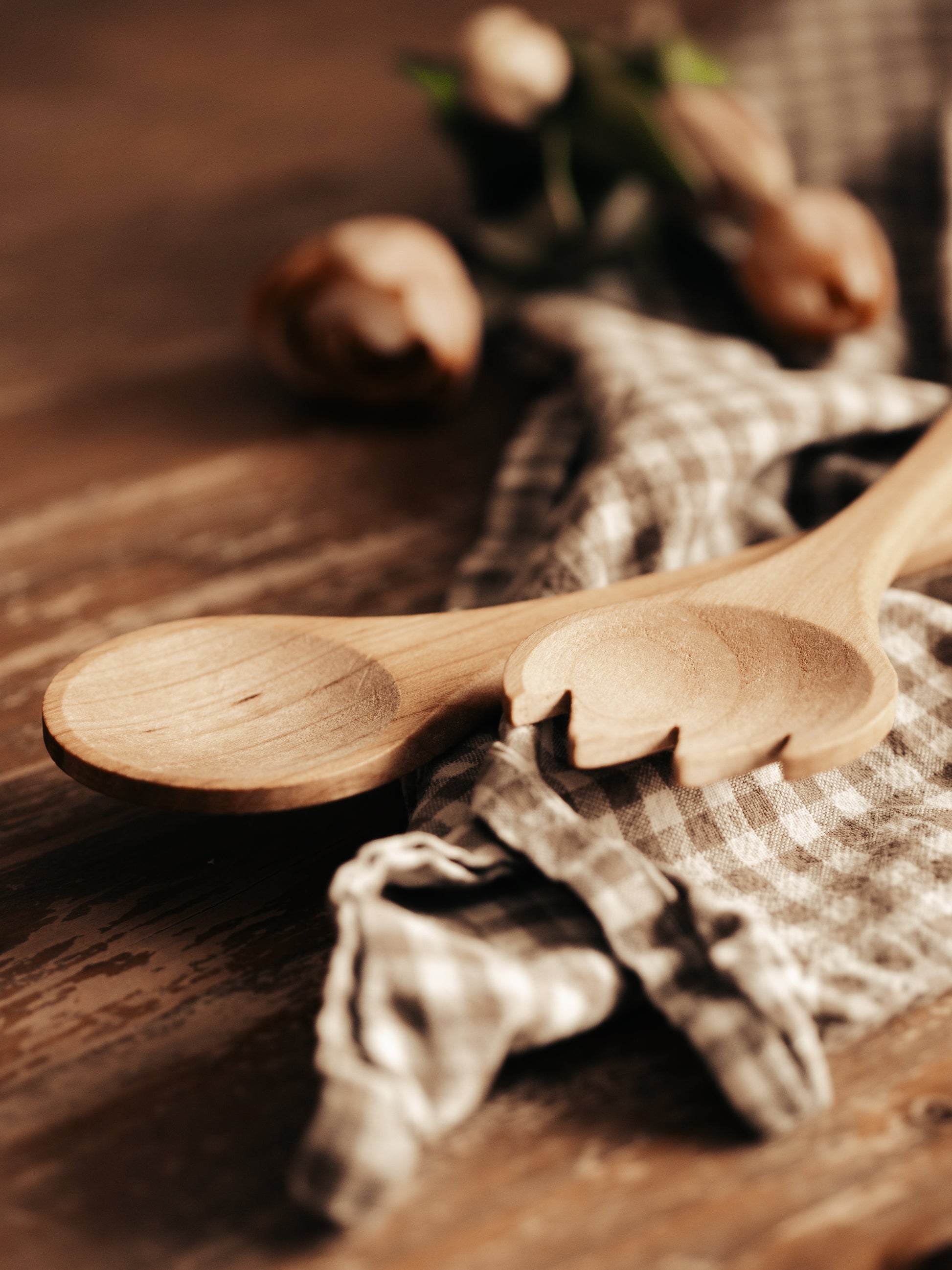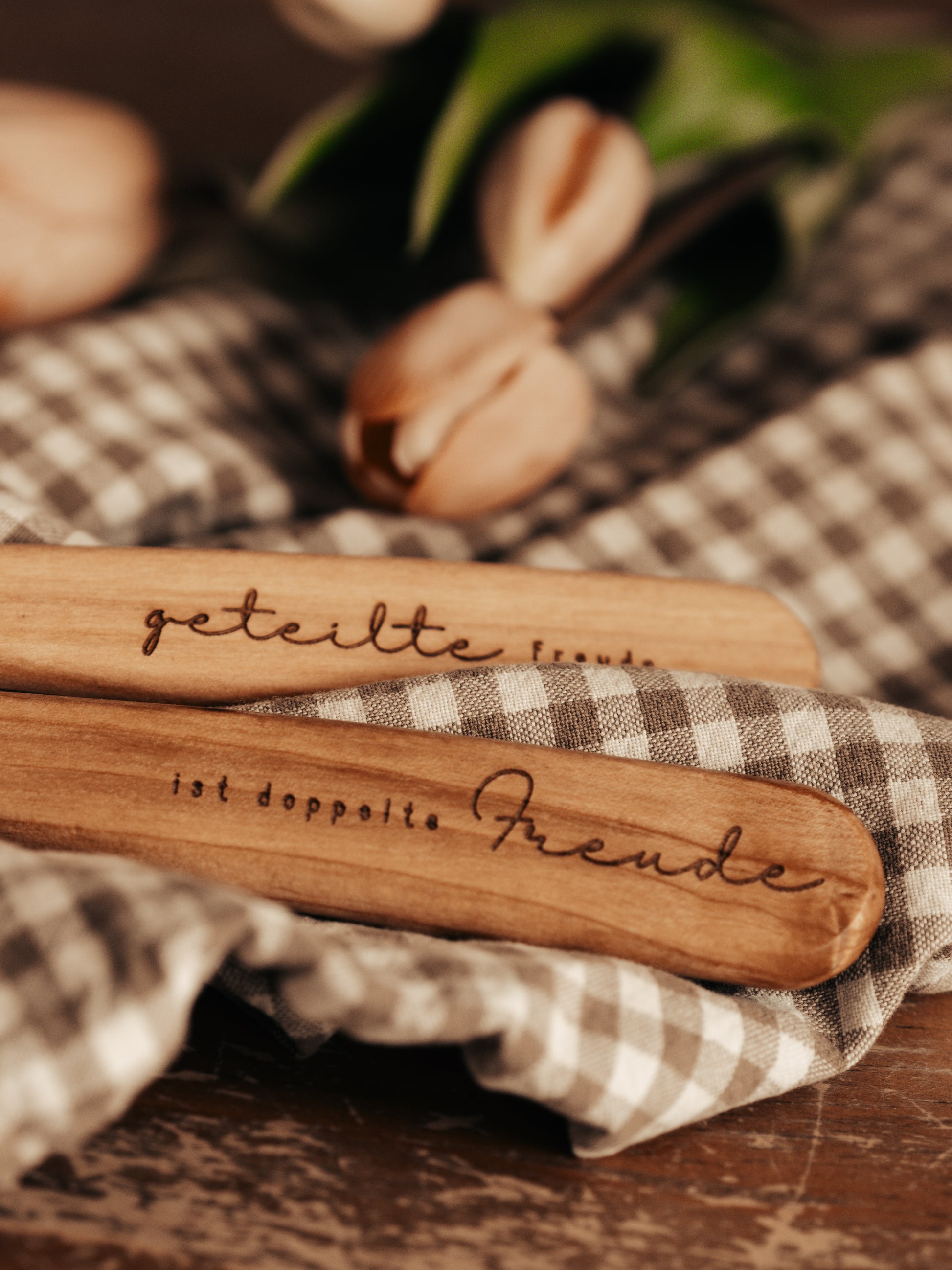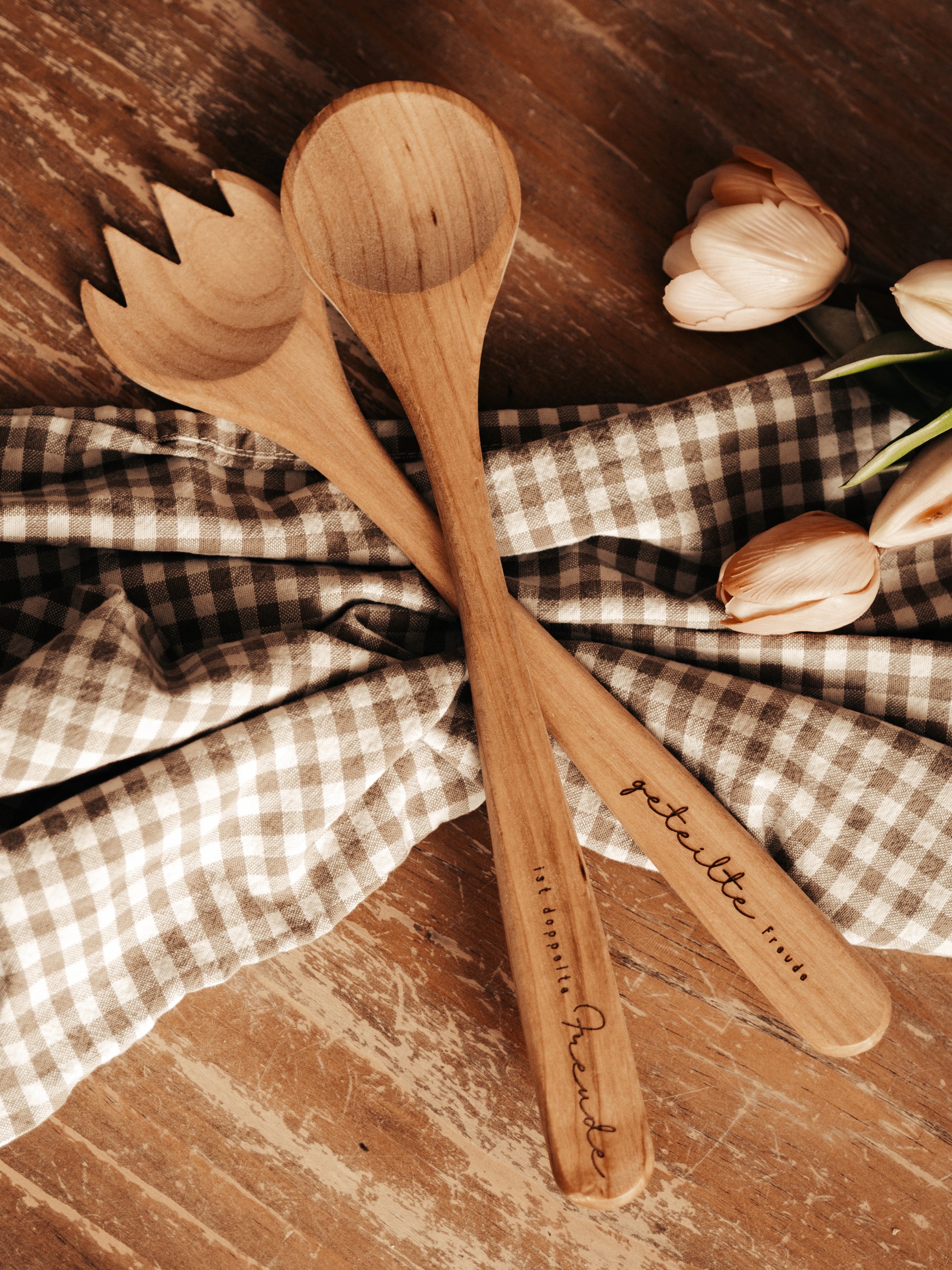 Hochwertiges Salatbesteck aus Kirschholz mit der Aufschrift "geteilte Freude ist doppelte Freude". Weil eine geteilte Mahlzeit viel schöner ist, als alleine am Tisch zu sitzen :-)